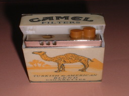 キャメルのライター 4×6cm 98年、香港、女人街で購入。 もっぱら、蚊取り線香やお香に 火をつけるのに 使いまくっていたら、 ガスがなくなって、 もう点かない。 しかも、フタがプラスチックなので 火でちょっと溶けてしまった。 キャメルの絵って いまいちかわいくない。 |